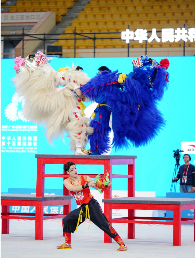 在展现力量、技巧与艺术表现力的北狮自选项目中,队员们完美演绎了《魔童伏狮》,巧妙融合哪吒神话与现代舞狮技艺。两头雄狮一白一青,白狮象征哪吒的纯真与赤诚,青狮暗喻混世之力与蜕变挑战;引狮员化身俏皮哪吒,手持绣球,灵动跳跃间与双狮嬉戏逗趣,脚踏风火轮,唤醒双狮,白狮腾跃而起,青狮伏地蓄势。鼓声激昂,三者合力托举“乾坤圈”,定格于“勇破桎梏,心向光明”的磅礴画面,升华至守护信念、包容共生的精神内核。他们或威猛刚劲,或活泼俏皮,将力与美、技与艺完美融合,最终力压群雄,问鼎冠军。这一刻,“狮山”的精神与“龙湖”的灵气,在舞狮少年的腾挪跳跃间得到了最生动的诠释。