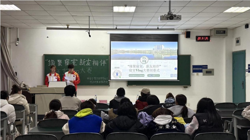 为丰富校园寝室文化,促进同学和谐共处,2025年11月14日20:30,体育学院学生会劳动与生活服务部在第一教学楼B204教室举行2025-2026学年“领跑者”体育文化节之“缘聚寝室新友相伴”寝室vlog大赛。活动由黎之芝,曾涛主持。本次vlog大赛采用“线上投票+线下展演评审”的联动模式,极大地提升了活动的参与度与影响力。