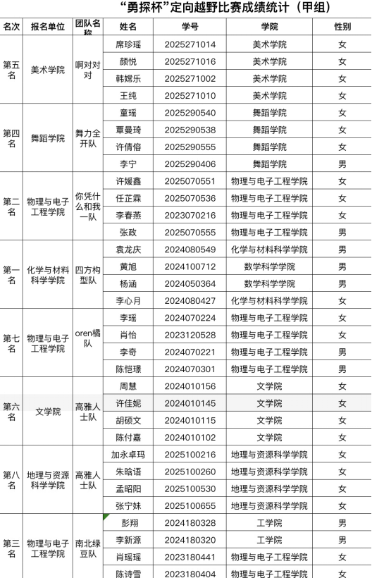 随着最后一支队伍冲过终点,“勇探杯”定向越野比赛圆满落幕。选手们在赛后的合影中笑意盎然,用镜头定格这场兼具趣味与挑战的体育盛宴。来自化学与材料科学学院的四方构型队力压群雄凭借出色的方向感,迅速锁定打卡方位,拿下非体育学院组冠军殊荣。