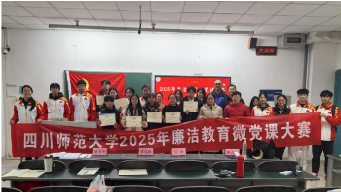 为深入推进廉洁文化建设,引导广大青年学子筑牢思想根基、涵养清廉品格,2025年11月19日中午12:30,四川师范大学体育学院、服装与设计艺术学院、外国语学院、计算机科学学院四学院在第一教学楼A103教室成功举办2025年廉洁教育微党课大赛总决赛。服装与设计艺术学院分团委书记谢威海,体育学院学工办主任兼分团委书记蔡存军,外国语学院2023级辅导员蒋建政,四川省互联网学院2025级辅导员王梦柯共同担任微党课大赛评委。