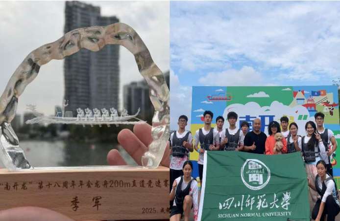 近日,四川师范大学体育学院喻雪莲副教授率领四川师范大学“金鲨”龙舟队,赴成都双流区麓客岛参加南开大学“南开龙”龙舟队举办的第十八周年年会龙舟200米直道竞速赛。在激烈角逐中,“金鲨”龙舟队奋勇争先,最终荣获季军佳绩。