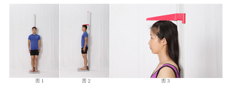 测试时,受试者赤足,背向立柱站立在身高计的底板上(图1);躯干自然挺直,头部正直,两眼平视前方,保持耳屏上缘与眼眶下缘呈水平位(图2);上肢自然下垂,两腿伸直,两足跟并拢,足尖分开约60度。足跟、骶骨部、两肩胛间与立柱相接触,呈“三点一线”站立姿势(图3)。