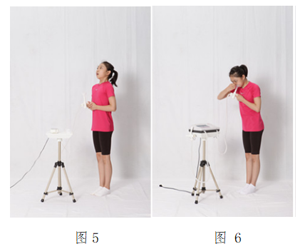 测试时,受试者呈自然站立位,手握文式管手柄,使导压软管在文式管上方,头部略向后仰,尽力深吸气直到不能吸气为止(图5);然后,将嘴对准口嘴缓慢地呼气,直到不能呼气为止(图6),此时显示屏上显示的数值即为肺活量值;测试2次,记录最大值。