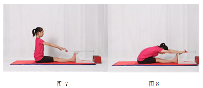 受试者面向仪器,坐在软垫上,两腿向前伸直;两足跟并拢,蹬在测试仪的挡板上,脚尖自然分开约10—15厘米(图7);测试时,受试者双手并拢,掌心向下平伸,膝关节伸直,身体前屈,用双手中指指尖匀速推动游标平滑前行,直到不能推动为止(图8)。受试者共测试2次,测试人员记录最大值。