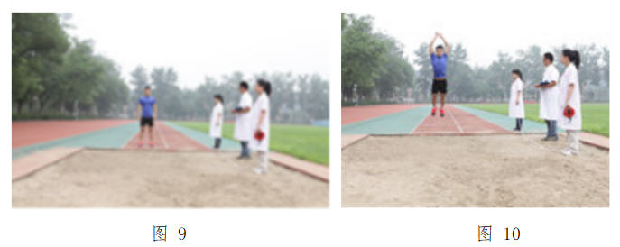测试时,受试者两脚自然分开,站在起跳线后(图9),双脚原地同时起跳(图10)。3次试跳均无成绩者,须再跳,直至取得成绩为止。