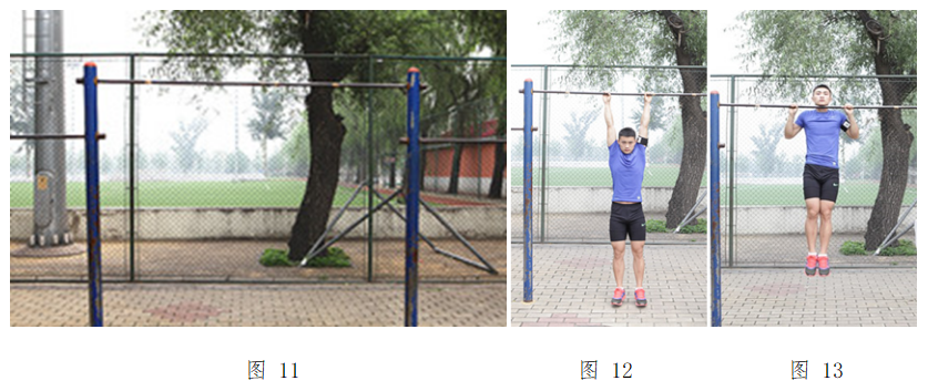 引体向上采用高单杠或高横杠进行测试,杠的粗细以受试者手能握住为准(图11)。受试者面向单杠,自然站立;然后跃起正手握杠,双手分开与肩同宽,身体呈直臂悬垂姿势(图12);待身体停止晃动后,两臂同时用力,向上引体;引体时,身体不得有任何附加动作,当下颌超过横杠上缘时,还原,呈直臂悬垂姿势,为完成1次(图13)。测试人员记录受试者完成的总次数。