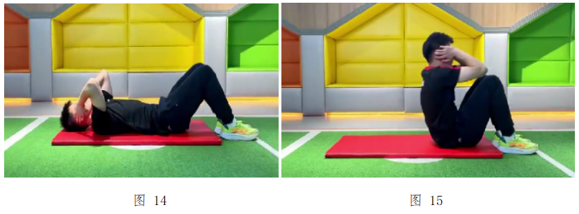 测试时,受试者仰卧于软垫上,两腿稍分开,屈膝呈90度(图14);测试人员发出“开始”口令的同时受试者坐起,两肘触及或超过双膝为完成一次(图15),以1分钟完成的次数为最终成绩。