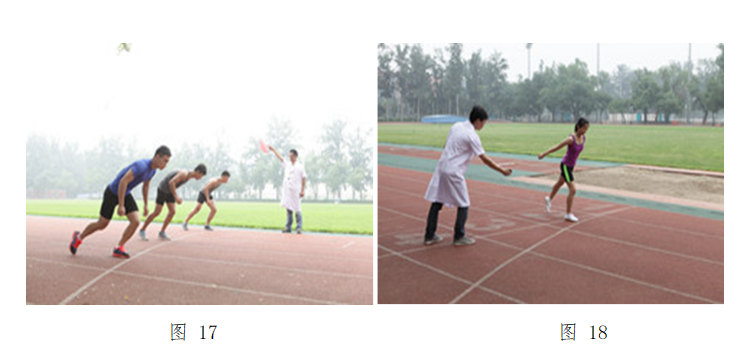 测试时,受试者至少2人一组,站立式起跑。当听到起跑信号后,立即起跑,全力跑向终点线(图17)。当受试者跑完全程,胸部到达终点线的垂直面时停表(图18)。