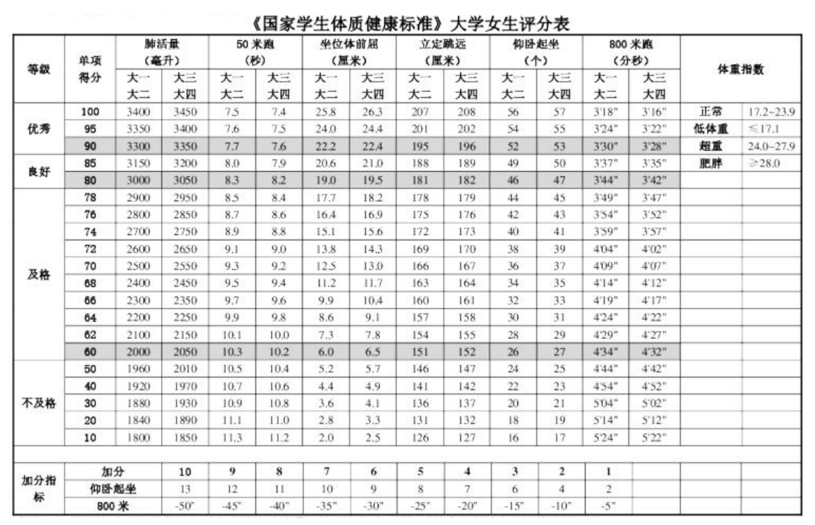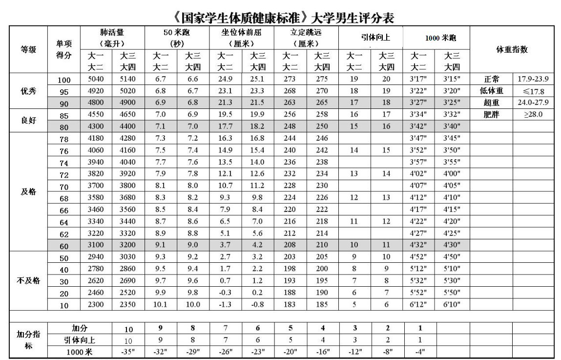 为了帮助同学们提前了解体质健康测试并做好相应的准备,以便在测试中取得更好的成绩以及降低运动损伤发生的风险,特编制此《须知》,具体测试项目、测试方法、安全事项和《国家学生体质健康标准》评分表如下: