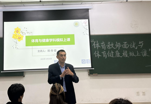 2025年10月25日下午,四川师范大学体育学院“我为母校献堂课”学术活动月讲座在A117教室顺利开展。我院2001级校友、深圳市龙岗区外国语学校高级教师熊传福,以“体育教师面试与体育健康课程模拟上课”为主题,结合示范教学、学生实操、经验分享三大环节,为体院学子带来新课标适配的就业实战指导。同时特邀2021级校友何文静分享广东(深圳)体育考编策略与心得,提供针对性地区就业参考。