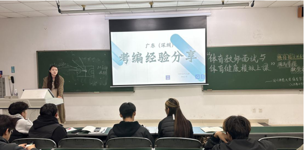 本次讲座创新采用 “案例讲解 + 场景实操 + 经验分享” 的三维形式,讲解环节结合体育学科特点拆解新课标课堂设计逻辑,实操环节通过分组备课、现场试讲实现 “学练结合”,分享环节邀请上岸教师倾授考编干货。这不仅帮助同学们掌握了符合 “健康第一” 理念的体育课堂设计方法,更精准明确了考编笔试的专业知识重点与面试的试讲、示范核心要求,最终为体育专业学子搭建起 “理论 - 技能 - 经验” 的完整成长链,切实筑牢了应对就业竞争的实战基础。